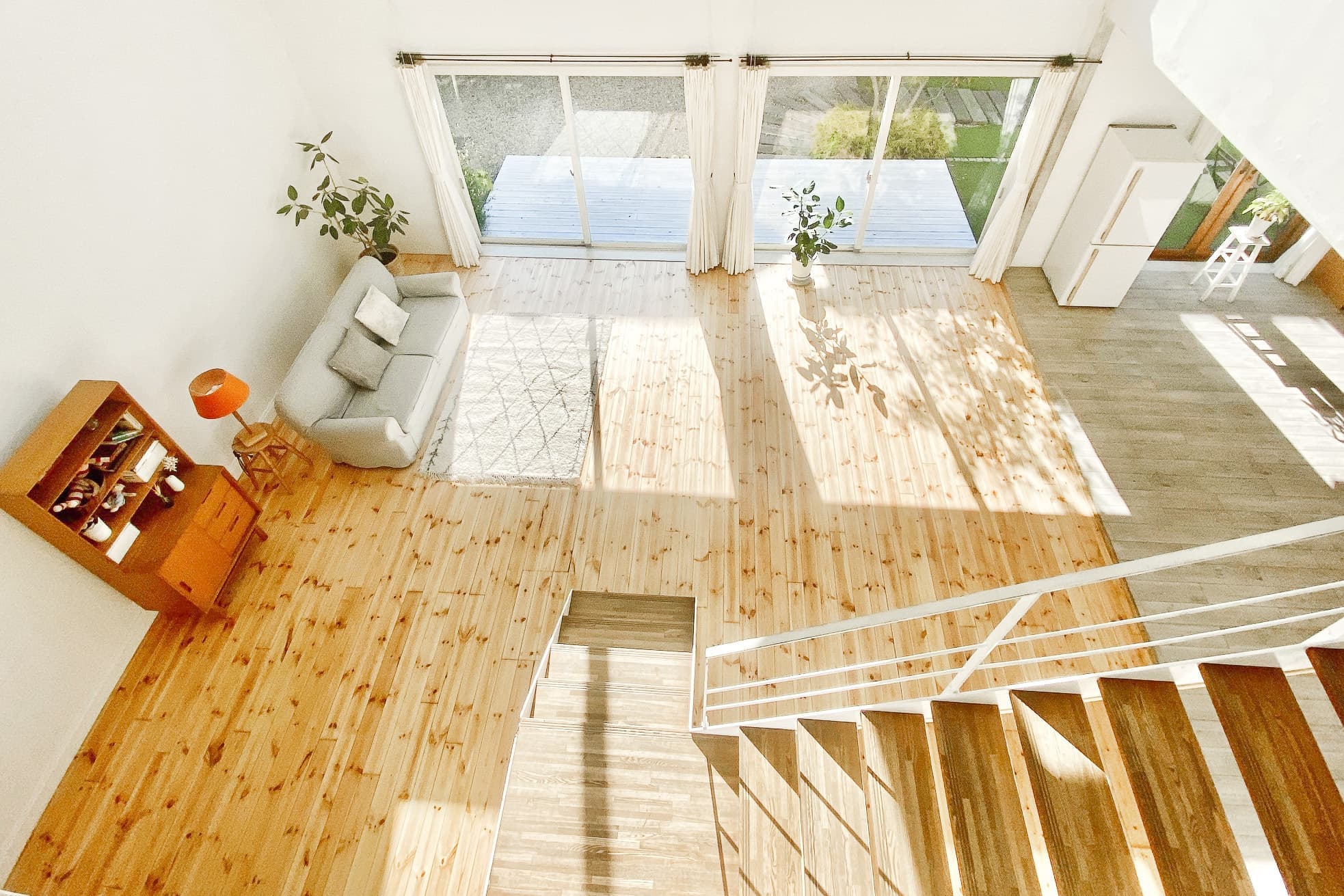 完全遮光ではないですが、天上、南側の2段の大きな窓などは遮光できます。